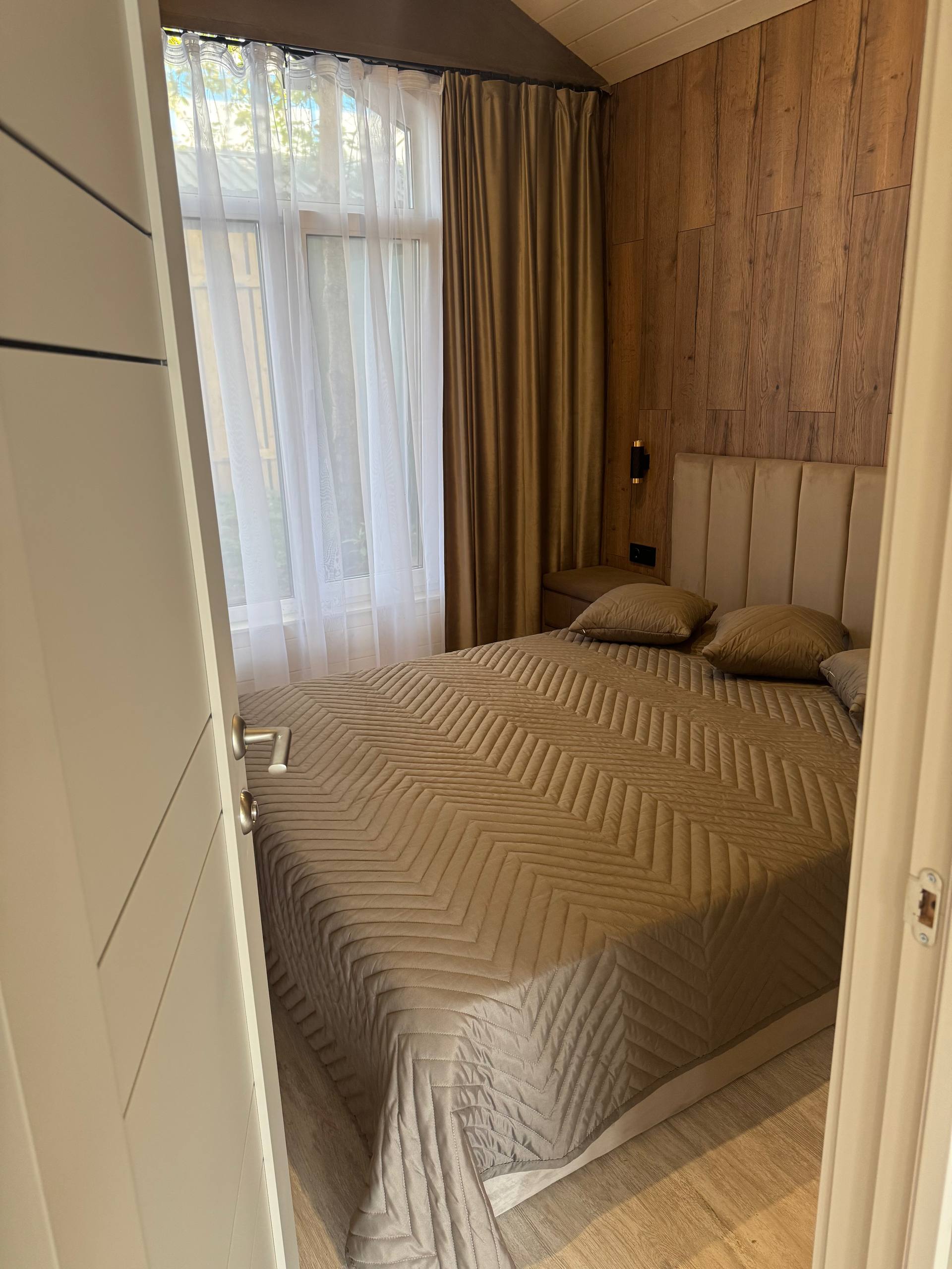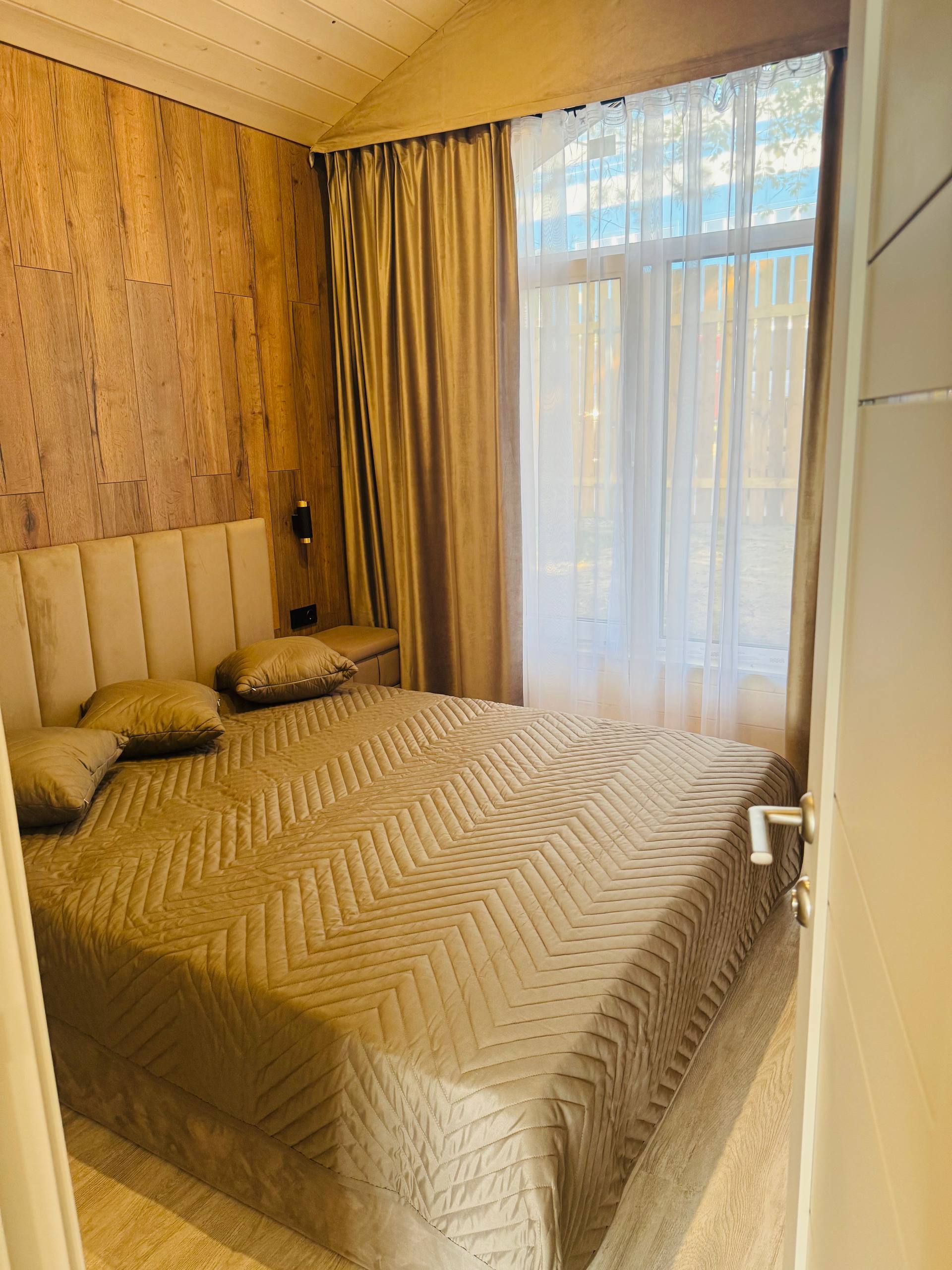 ✨ Для Вашего удобства в домике 2 спальни, кровати с ортопедическими матрасами, уютная гостиная, совмещённая с кухней и обеденной зоной, санузел с душевой кабиной, на кухне есть вся необходимая посуда для приготовления пищи, индукционная плита, холодильник, чайник, микроволновая печка, телевизор. Постельное бельё, полотенца, одноразовые тапочки. На террасе также два мягких стула, диван и журнальный столик, кресло- качели, для утреннего отдыха или романтического времяпрепровождения с аутентичной вечерней подсветкой.